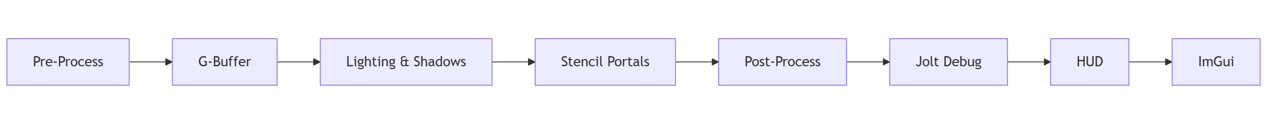 - DirectX 11 Renderer: A modular deferred rendering pipeline with an abstracted API layer, supporting custom HLSL materials, stencil-based portals, and a per-camera post-processing stack.